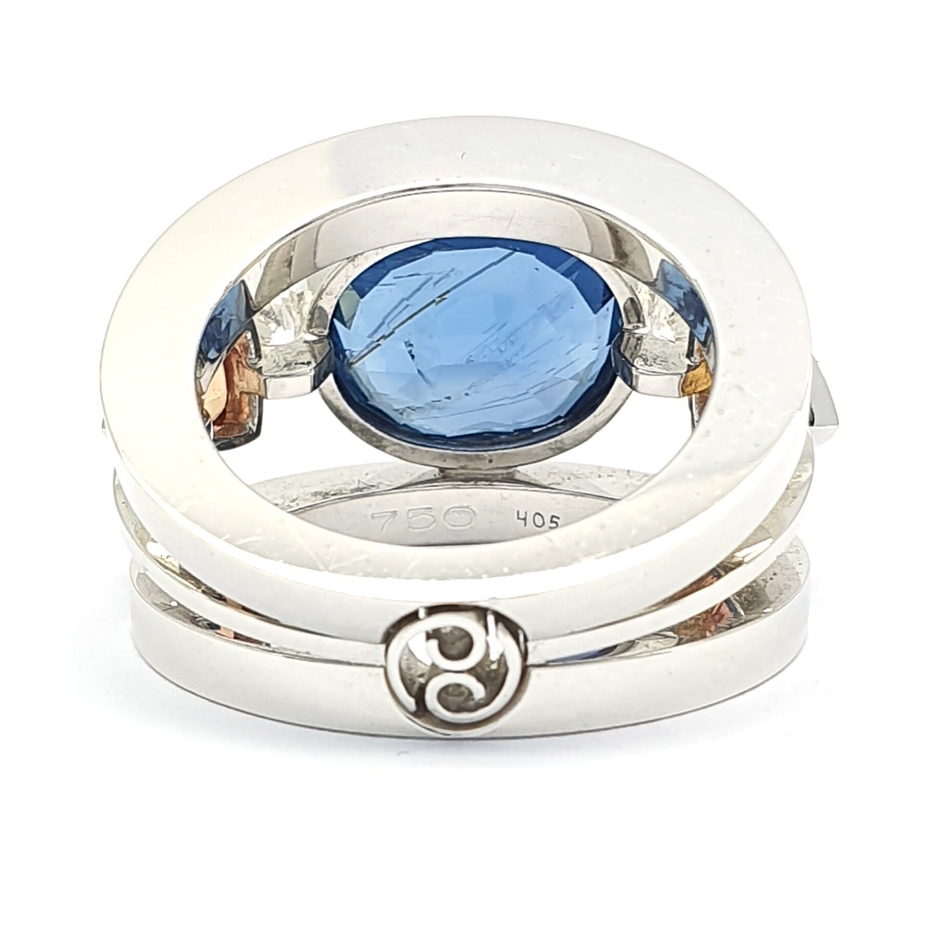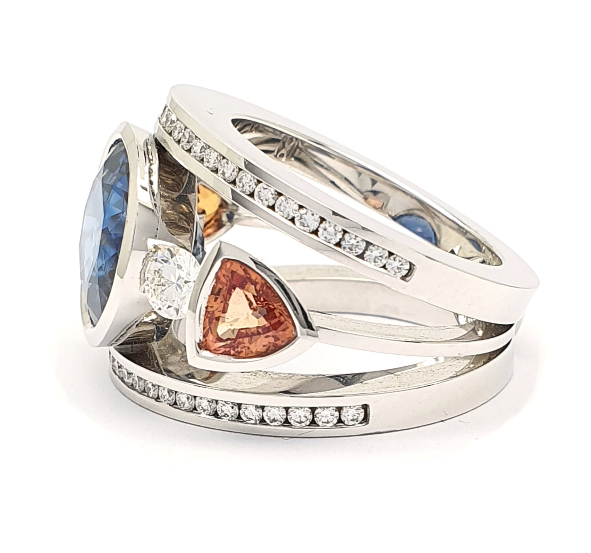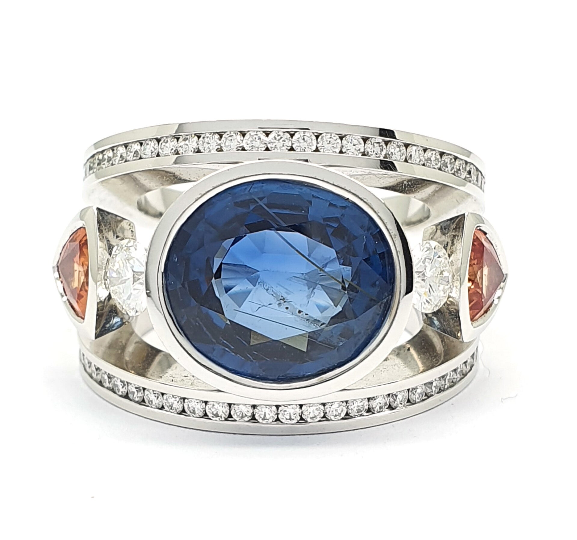 18k witgouden saffier ring Sri Lanka onbehandeld. 9,45ct. en 2 triljanten saffieren +/- 0.48ct. diamanten fg-vvs h&a +/- 0.58ct. fg-vvs h&a. +/- 22.7 gram hand vervaardigd Eigenmann.