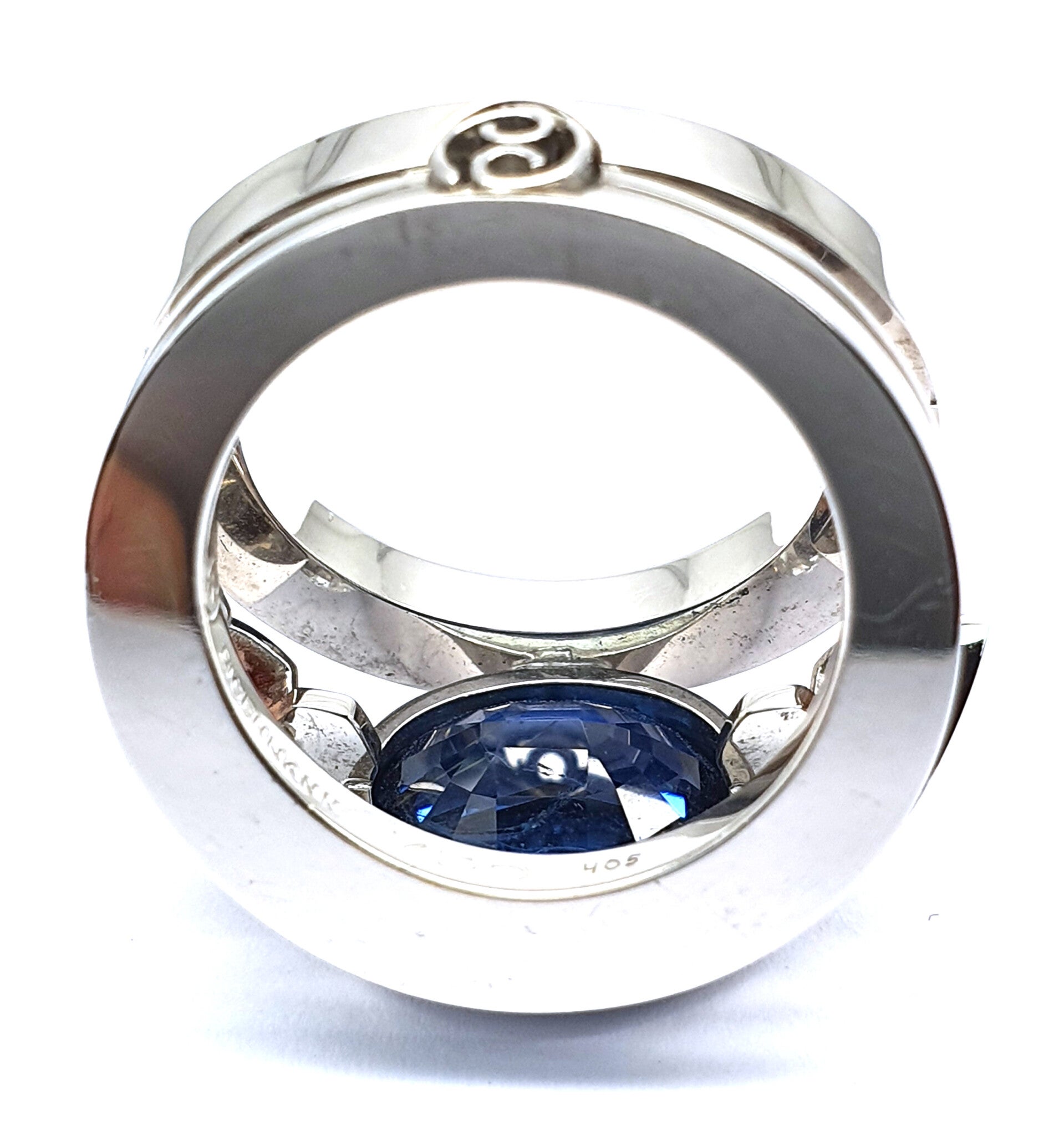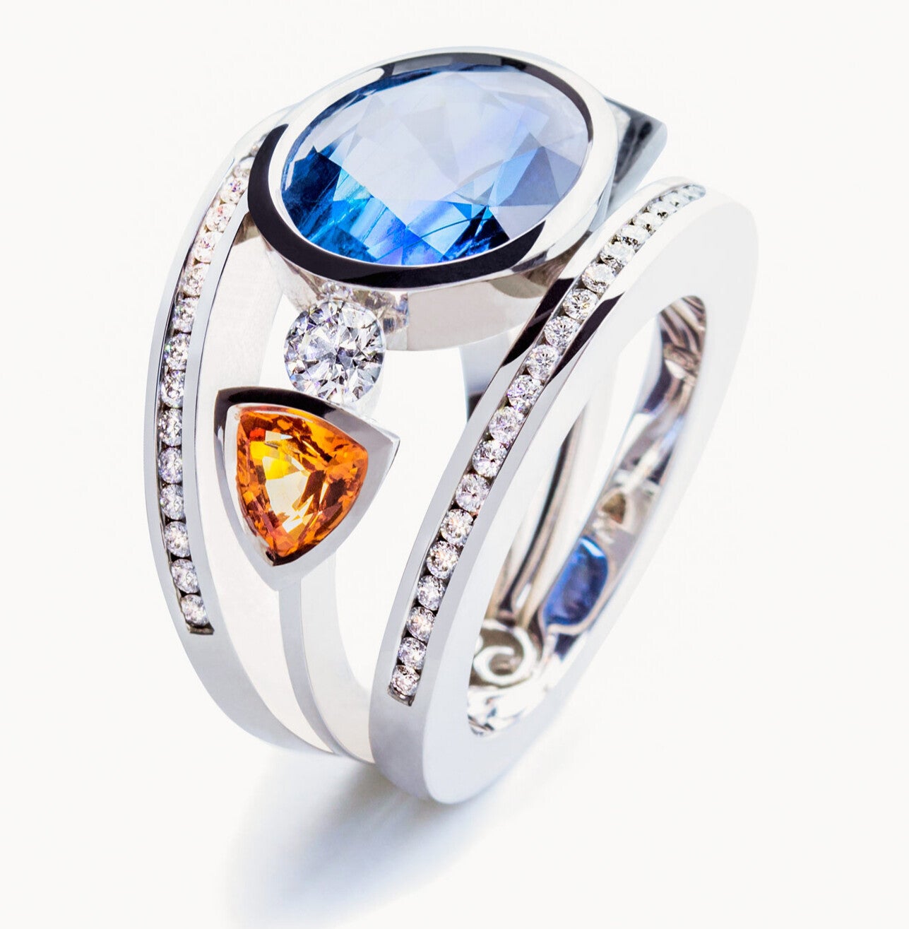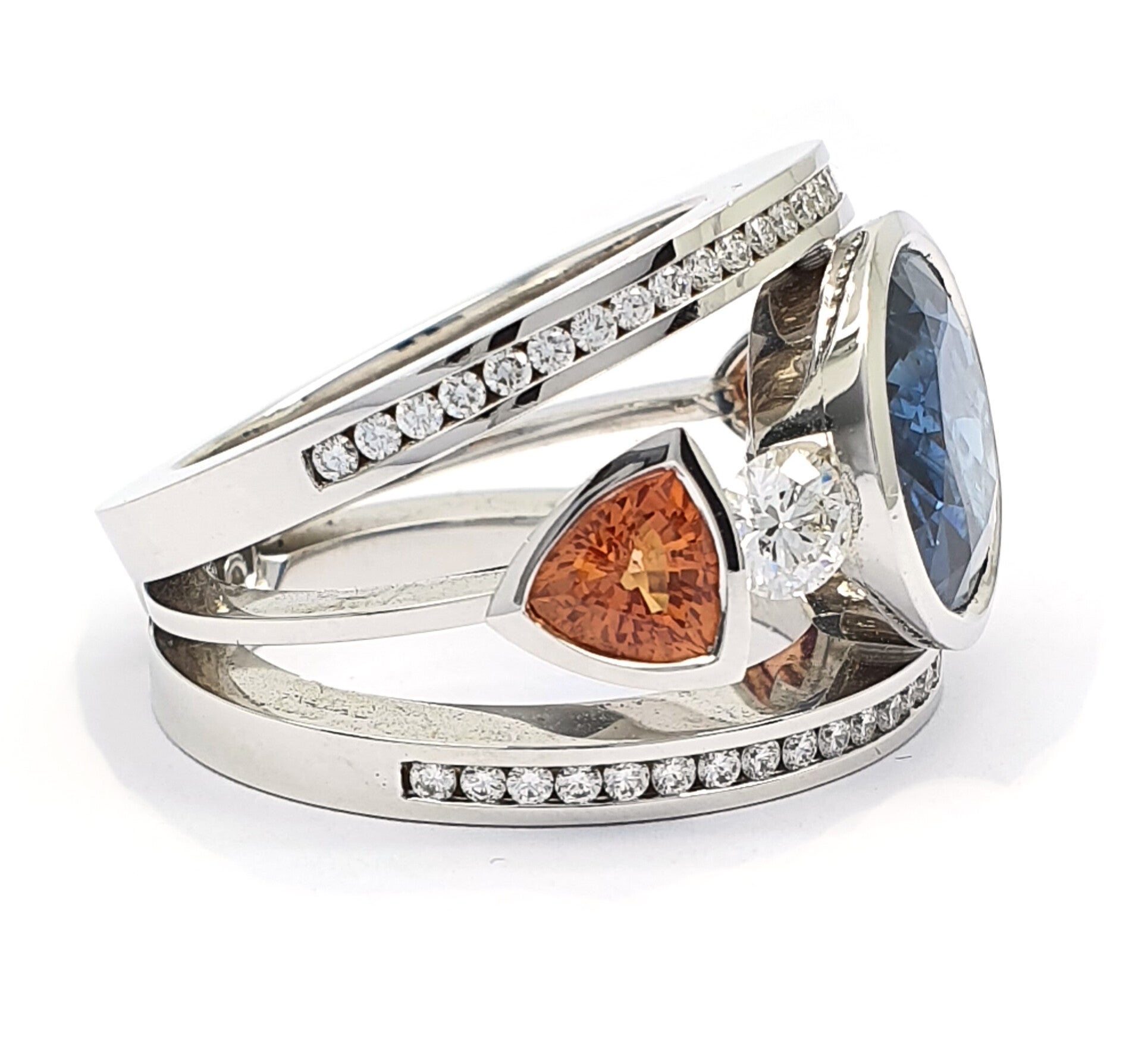 18k witgouden saffier ring Sri Lanka onbehandeld. 9,45ct. en 2 triljanten saffieren +/- 0.48ct. diamanten fg-vvs h&a +/- 0.58ct. fg-vvs h&a. +/- 22.7 gram hand vervaardigd Eigenmann.