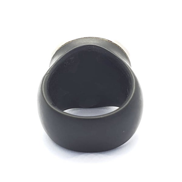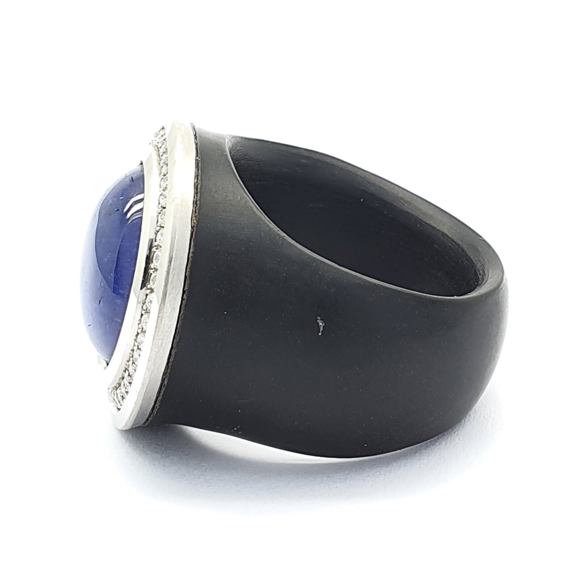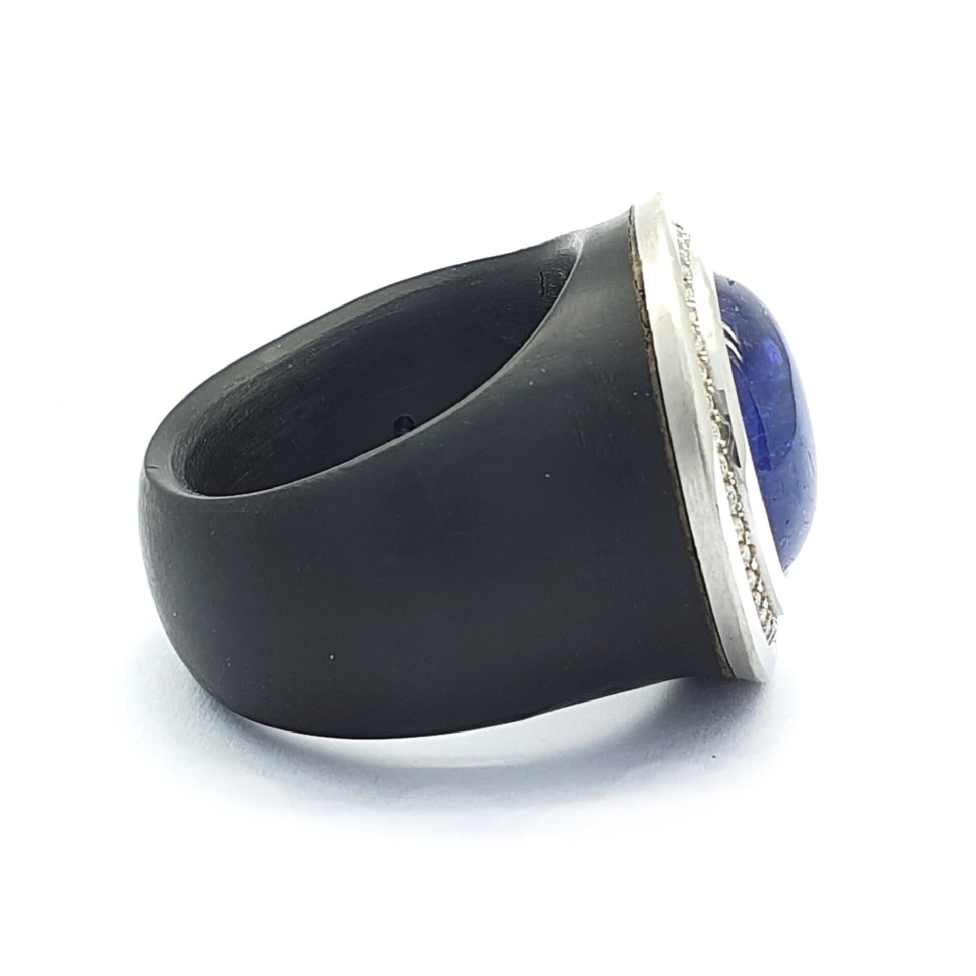 Een handvervaardigte POM ring, bezet met een ronde cabbochon geslepen Tanzaniet 12.08 karaat in een modulair gezet diamant entourage. 36x 0.36 karaat FG-VVS